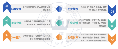 北实外【日本国际高中班】是由北京市实验外国语学校携手日本本土第一所也是唯一一所由私塾建立的日本语言学校【行知学园】于2019年共同创办,学制三到四年,学生要学习国内高中全部必修课程和日本留学考EJU课程(留学生统一考试),学生零起点学习日语,参加日语能力证书JLPT考试,在毕业时可以拿到日语二级N2或一级N1证书,同时,学生也会学习托福TOEFL课程,无需校外培训,并取得国内高中毕业证书,在高三毕业后由行知学园负责推荐院校,办理全部申请手续,最终以留学生身份顺利升入日本大学。