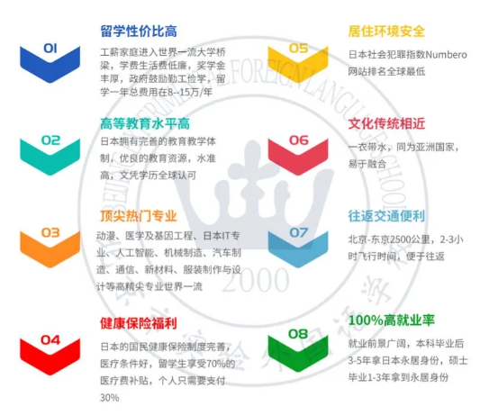 教育水平高,奖学金多,日本经济发达,就业机会多,我们都知道日本是一个经济大国,拥有着很多世界知名企业,我们毕业后也可以选择留在日本寻找就业机会,入学门槛也不高,日本是出了名的礼仪之邦,社会的治安是十分完善的,人们之间的关系是非常和谐。