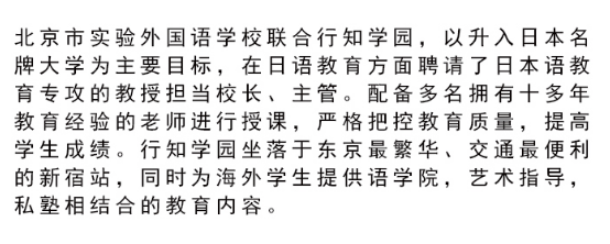 北京市实验外国语学校牵手日本行知学园共同开办北京市实验外国语学校日本国际高中班,行知学园是日本第一所也是唯一一所由私塾建立的日本语学校。