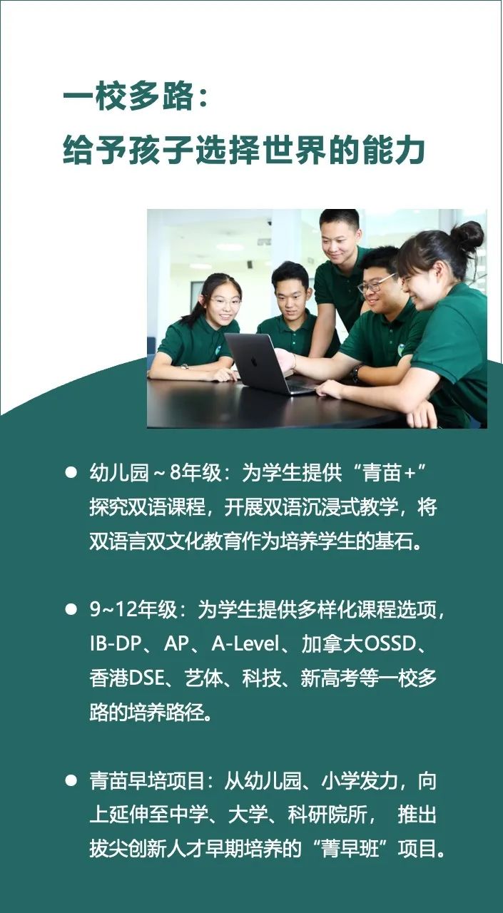 IB-DP、AP、A-Level、加拿大OSSD、香港DSE、艺体、科技、新高考、菁早班等一校多路的培养路径,满足不同家庭对于教育的多元需求,让每个孩子找到真正适合自己的成长路径。