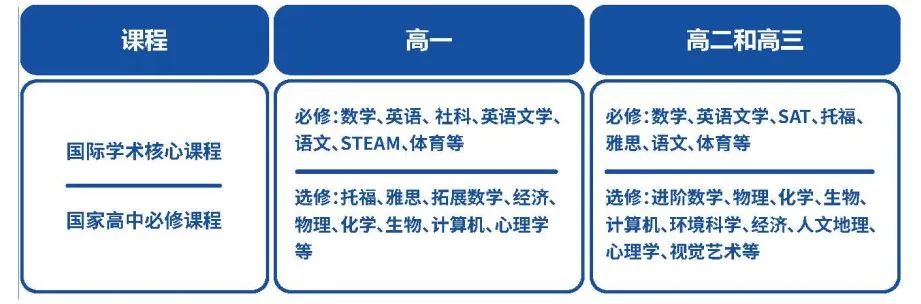 融合中外核心课程,开设AP和A Level双语和全英课程及国家高中必修课程。