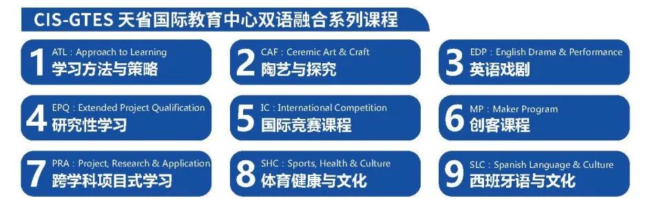 开设了丰富的双语融合系列课程。培育全人素养,提升多元智能,打造天省国际部的特色课程,全方位培养学生的学习力、领导力、坚毅力、创新力、思辨力等。