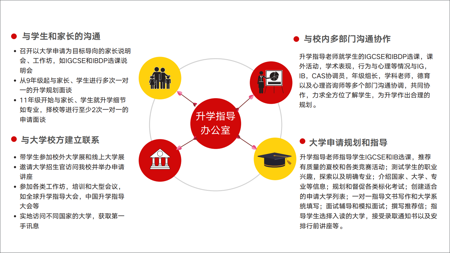 无锡市协和双语国际学校升学指导办公室自2016年成立以来,已成功指导4届毕业生去往世界各地的理想大学。升学指导办公室结合学校教学目标,课程特色和学生学术兴趣与专长,从9年级