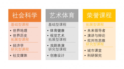 学校帮助学生确立正确的人生观念、构建完备的知识结构、整合未来社会所需的专项特长。各类课程设计均立足于面向全体基础上培育个体特长和群体英才。