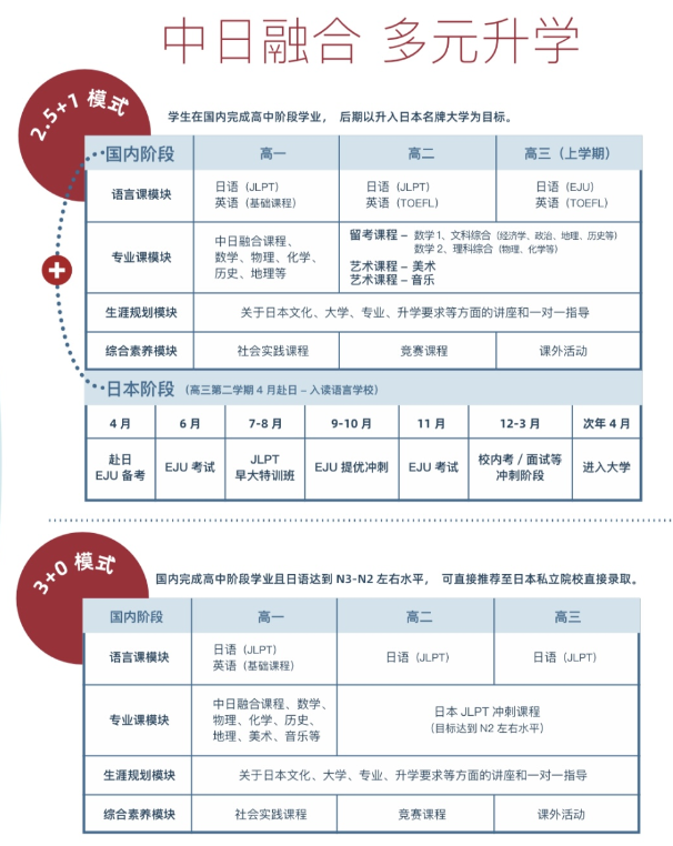 龙樱书院致力于提供以国家核心课程框架下的中日融合课程。引入日本升学课程,从日语(JLPT)、EJU日本留学试验应试能力、英语(TOEFL)、日本名牌大学校内考特训等全维度提升学生核心竞争力,为学生多元化的日本进学之路打下坚实的基础。