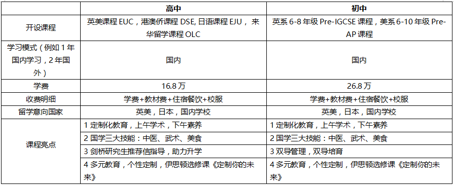 公学提供小初高、大学预科及外籍来华升学教育,招收来自于全球13岁至18岁入学的学生以及天才少年班的学生。公学提出定制化国际教育理念,设置英式A-LEVEL课程,高二还同时开设AP课程,以数学思维为特色,采用“半日学术、半日素养”的教学方式,致力于个性化人才培养模式。立志打造质量一流、效果佳的国际教育,让伊思顿成为首屈一指的世界留学广场。公学秉持着实现真正意义上因材施教、个性发展的教育教学示范国际学校,成为践行定制化国际教育的领导者和实践者,使每一位学生在伊思顿公学实现踏入自己理想大学和高校殿堂的梦想。