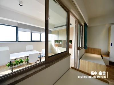 宿舍为标准四人间,每间均配置独立卫生间、淋浴间、洗漱间。每两间宿舍共享室内活动阳台,阳台配置了桌椅和家具供学生学习、讨论和交流,同时每个楼层都设置共享交流空间,配有冰箱、微波炉、沙发等家具,打造一个舒适放松的社交活动区域。